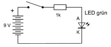 An der LED liegt in Durchlassrichtung eine konstante und weitgehend vom Strom unabhängige Spannung von etwa 2 V. In der Reihenschaltung teilt sich die Batteriespannung auf die Verbraucher auf. Am Widerstand von 1 liegen deshalb noch 7 V. Daraus kann der Strom von 7 mA berechnet werden. Der maximal erlaubte Strom für die LED ist 20 mA. Es gibt also noch genügend Reserven und damit ein langes Leben für die LED.