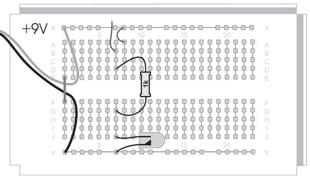 Bauen Sie eine LED-Leuchte mit Vorwiderstand und Schalter. Sobald Sie den Schalter schließen, leuchtet die LED hell auf.