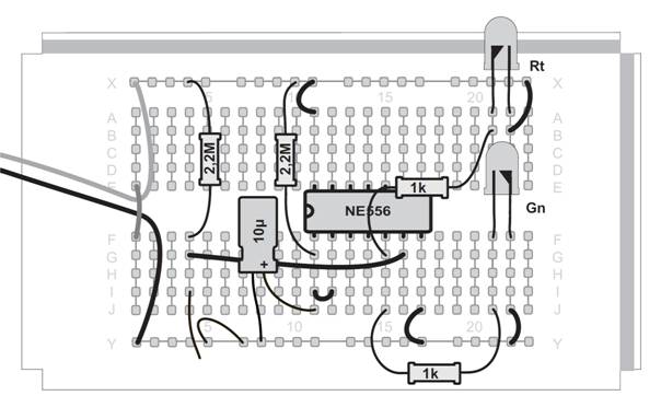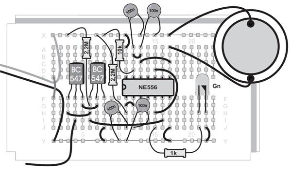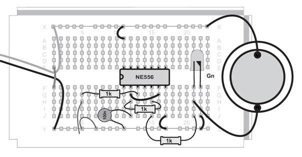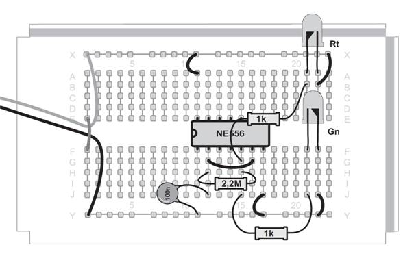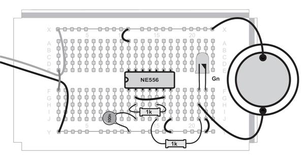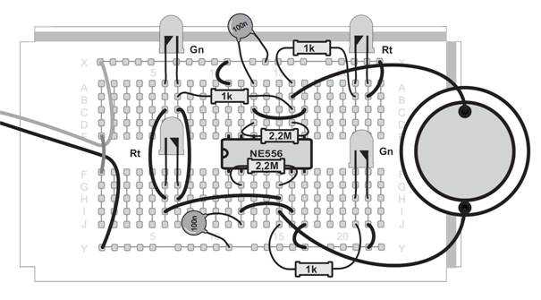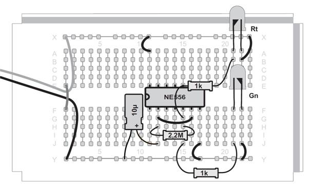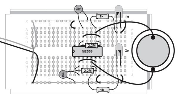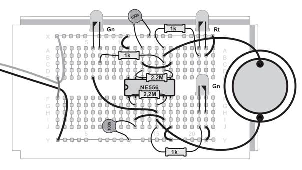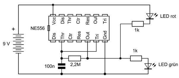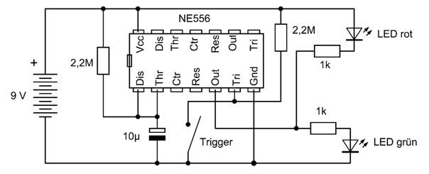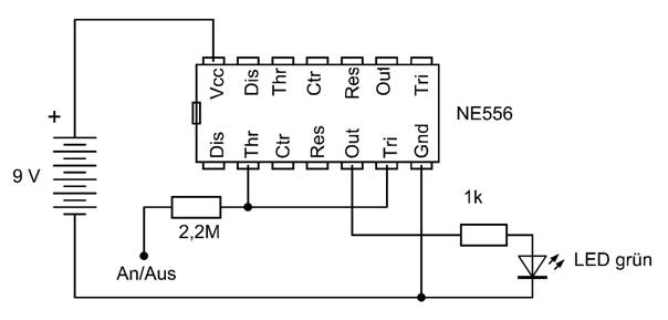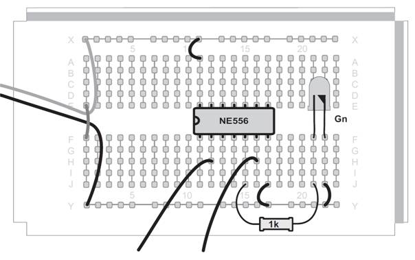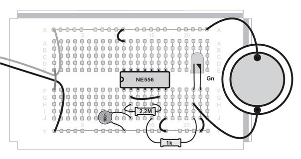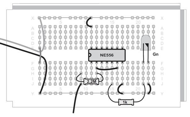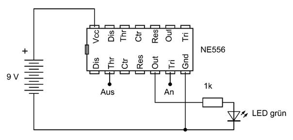 Schließen Sie am Ausgang (Out) des unteren Timers die grüne LED mit ihrem Vorwiderstand an. Zusätzlich sollen die beiden Eingänge Thr (Threshold, Schaltschwelle) und Tri (Trigger, Auslöser) mit Anschlussdrähten versehen werden. Die grüne LED kann nun entweder an- oder ausgeschaltet sein. Durch Berühren der Anschlussdrähte können Sie den Zustand umschalten. Das gelingt, weil Ihr Körper gewisse Störspannungen aus der Umgebung auffängt. Wenn die Spannung am Threshold-Eingang 2/3 der Betriebsspannung überschreitet, schaltet das IC die LED ein. Wenn umgekehrt die Spannung am Trigger-Eingang kleiner als 1/3 der Betriebsspannung wird, wird der Ausgang eingeschaltet. Durch  Antippen des Tri-Pins kann die LED also eingeschaltet werden, während ein Antippen des Thr-Pins sie ausschaltet. Falls der Versuch nicht auf Anhieb gelingt, bewegen Sie sich etwas hin und her, um sich geringfügig elektrisch aufzuladen.
