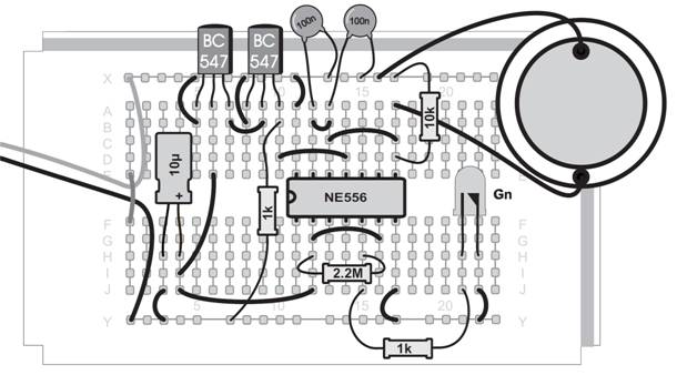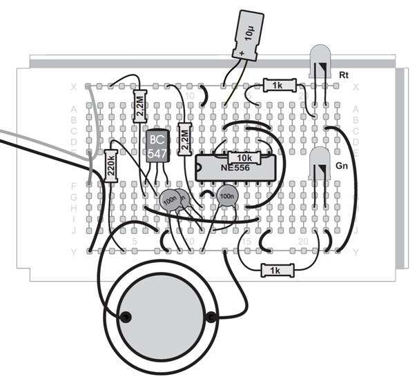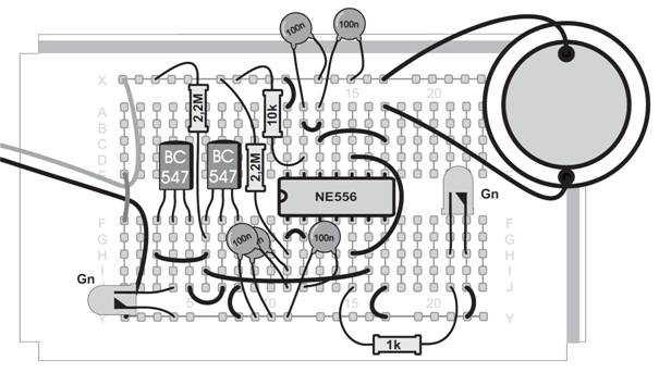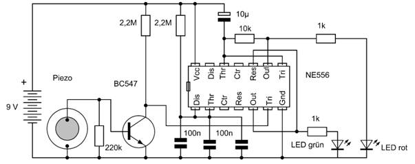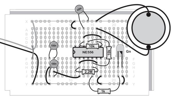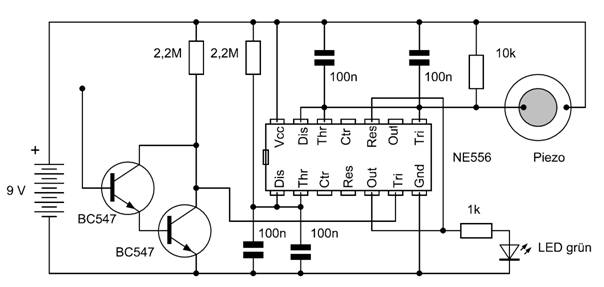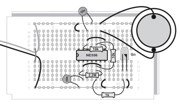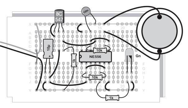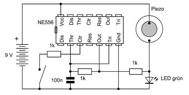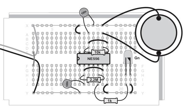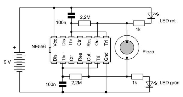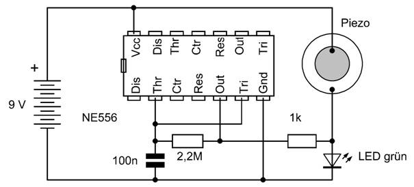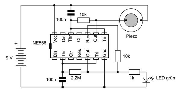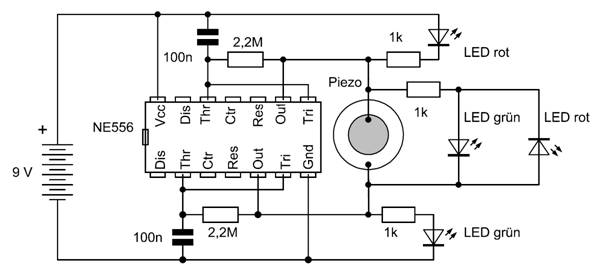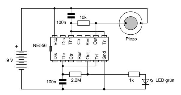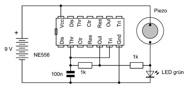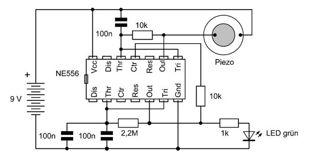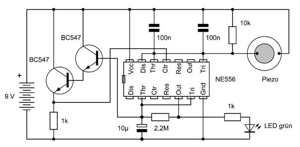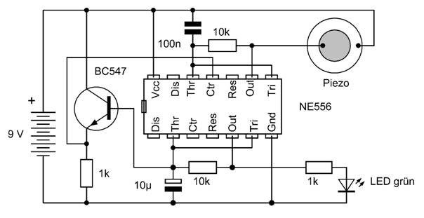 Zusätzlich ist in dieser Schaltung auch der Piezo-Schallwandler mit angeschlossen. Deshalb hört man bei jedem Umschalten des Ausgangs ein leises Knacken. Wenn Sie die Scheibe auf einer Membran befestigen, steigt die Lautstärke.