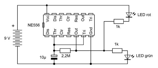 Gleichzeitig dient der untere Timer als Blinkschaltung. Beide Schaltungsteile arbeiten unabhängig voneinander und sind die Vorbereitung für weitere Versuche, in denen beide verbunden werden.
