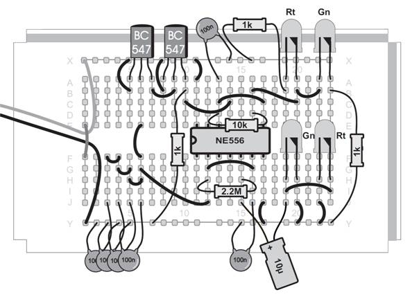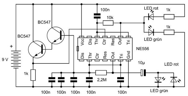 Der zweite Blinker wird fast gleich aufgebaut wie der erste, mit dem kleinen Unterschied, dass die rote LED im Interesse einer übersichtlichen Verdrahtung gegen Vcc angeschlossen ist. Zwischen beiden Ausgängen liegt außerdem der Piezo-Schallwandler. Er macht jede Änderung an jedem der Ausgänge hörbar.