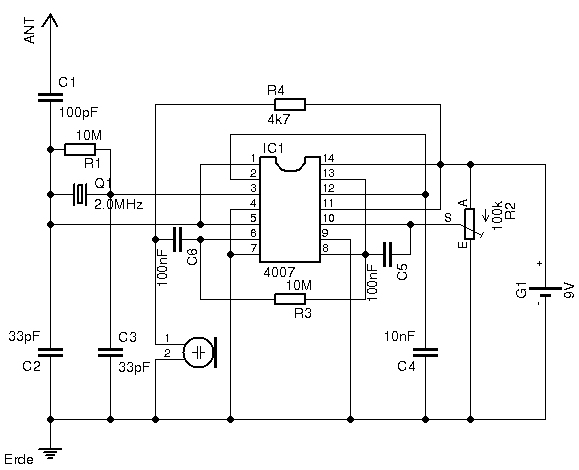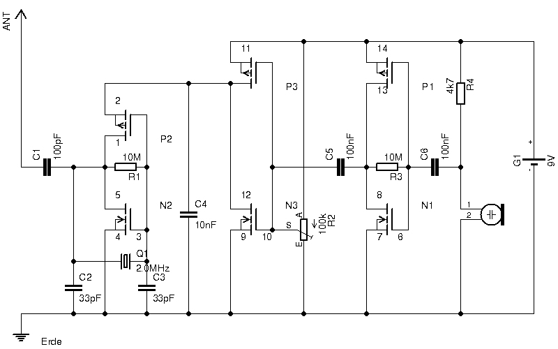 (10 M) einen quarzstabilen Oszillator, dessen Signal über C1 (100 pF) zur