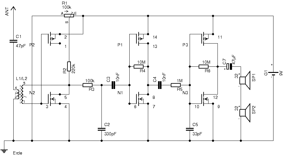 kommende NF-Signal wird von P1/N1 verstärkt. R4 (hier 4k7) ist an das jeweilig