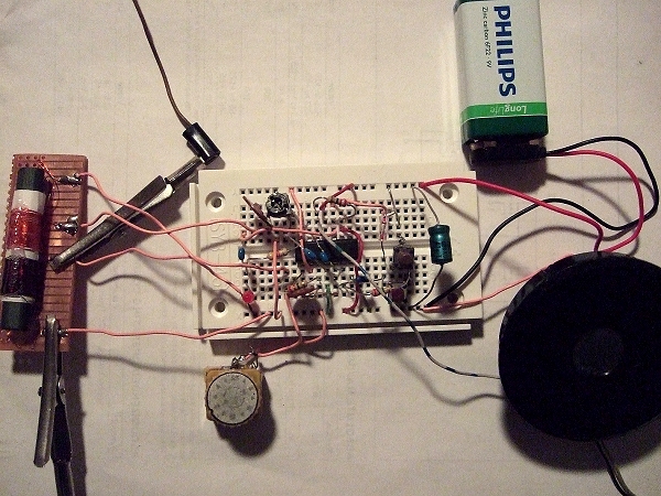 LM386-NF-Verstärker. Als Antenne reichen 2 m Draht. Als Erdung,