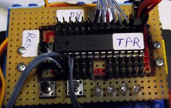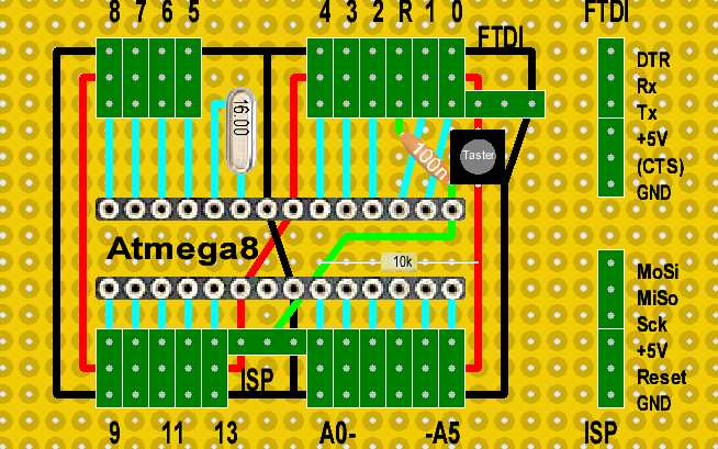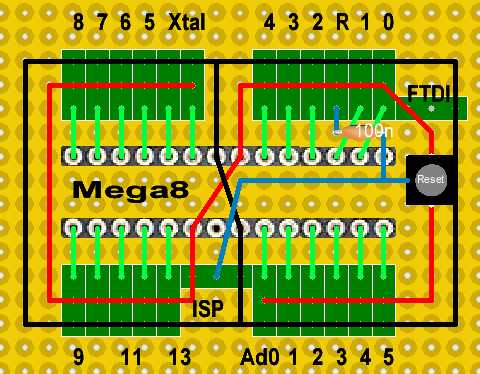 Mega8, Lochraster-Platine, 1mm Stifte, Draht usw.