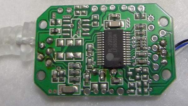 PL2303-Handyadapter. Die lachsfarbenen Felder bezeichnen die