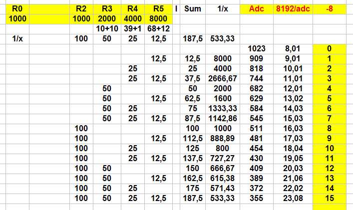 (Im Programm wurde der Wert 8192 um 1% erhöht, weil die Widerstände nach unten abwichen.)
