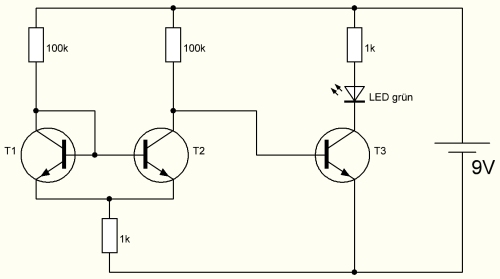 von T2, womit sich die Spannung U_be von T3 erhöht und die LED deutlich