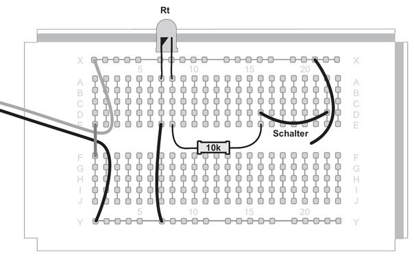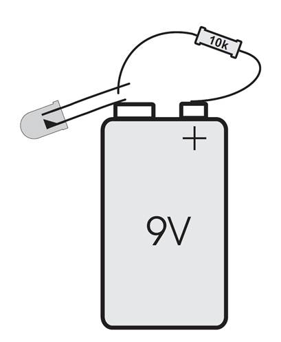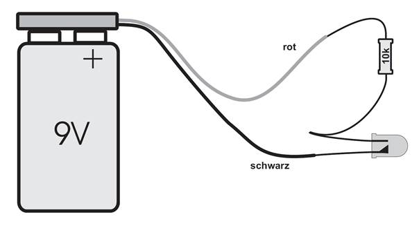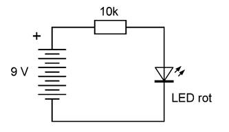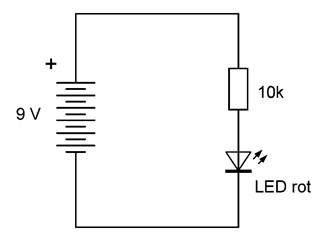 Das Schaltbild zeigt eine Reihenschaltung. Der Strom fließt durch Batterie, Widerstand und LED. Der Widerstand hat dabei die Aufgabe, die Stromstärke auf einen sinnvollen Wert zu begrenzen. Je größer der Widerstand, desto kleiner die Stromstärke. Bei 10 kΩ wird die LED zwar noch weit unterhalb ihres maximal erlaubten Stroms betrieben, sie leuchtet aber schon ausreichend hell.