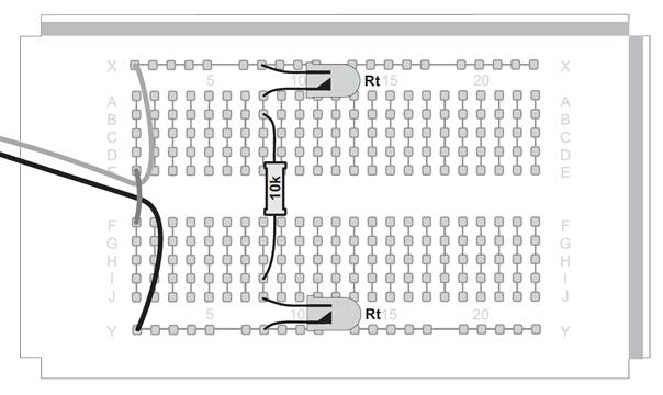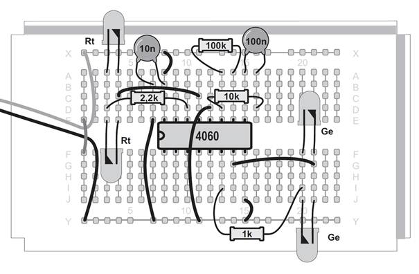 Der Oszillator arbeitet wieder mit dem extrem kleinen Kondensator aus zwei Kontakten der Steckplatine. Sogar mit einem großen Widerstand von 22 MΩ ergab sich damit eine hohe Frequenz. Die beiden gelben LEDs bilden aber einen noch viel größeren Widerstand, der noch dazu von der Umgebungshelligkeit abhängig ist. Beide LEDs sind so in Reihe geschaltet, dass immer eine von beiden in Sperrrichtung betrieben wird. Eigentlich dürfte also kein Strom fließen. Wenn aber Licht auf den LED-Kristall fällt, verhält sich die LED wie eine Fotodiode. Nun fließt auch in Sperrrichtung ein kleiner Strom. Je mehr Licht auf die LEDs fällt, desto größer wird dieser Strom und desto höher wird die Oszillatorfrequenz.