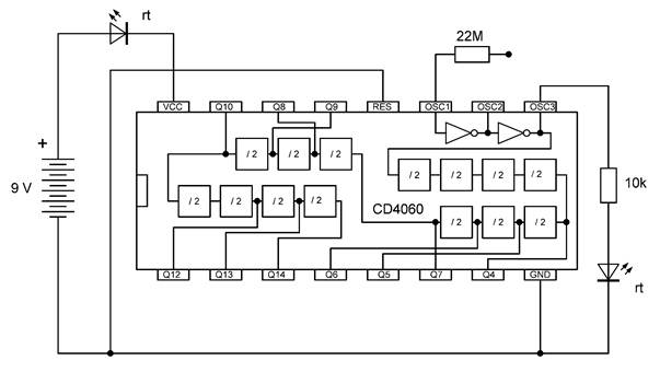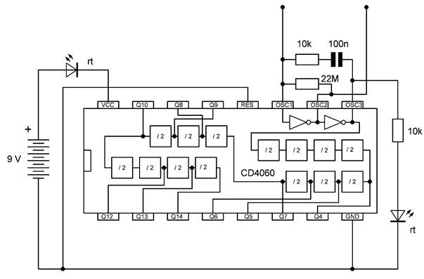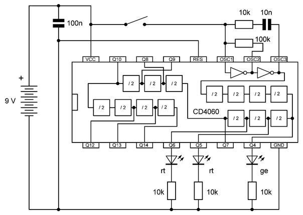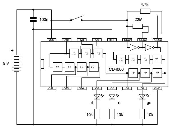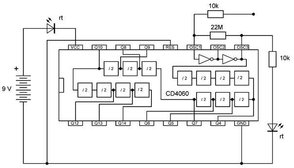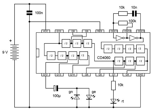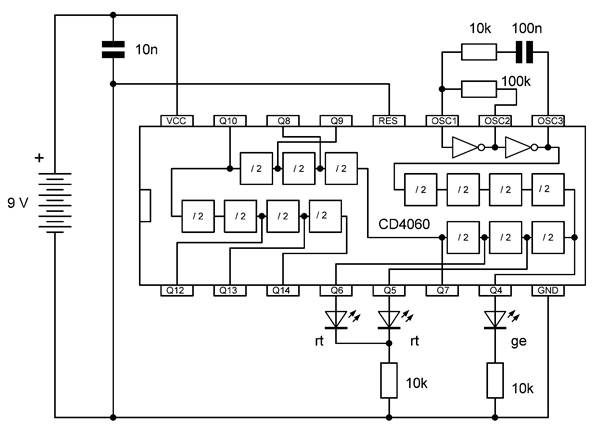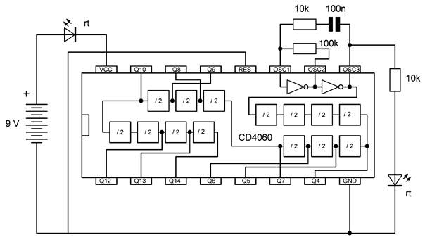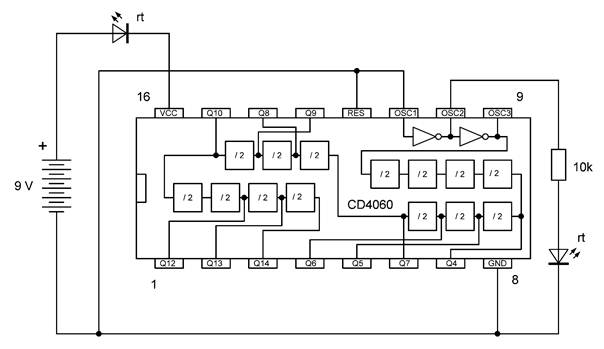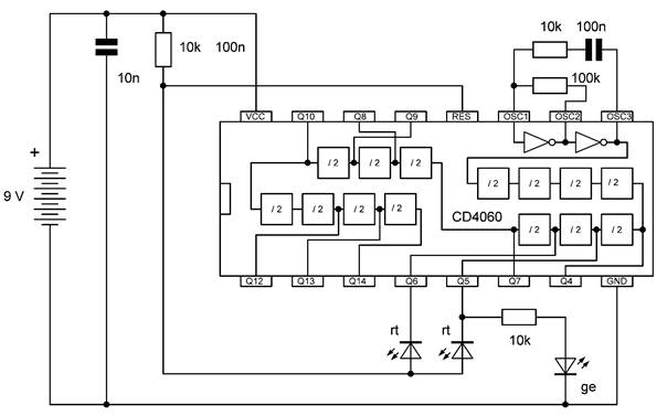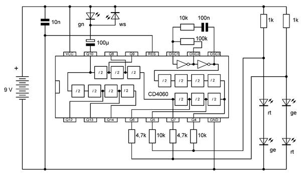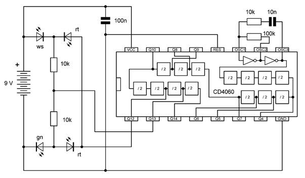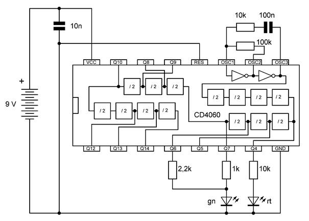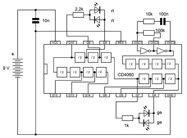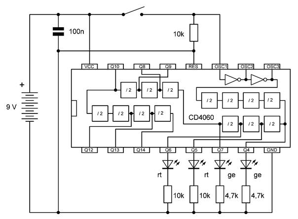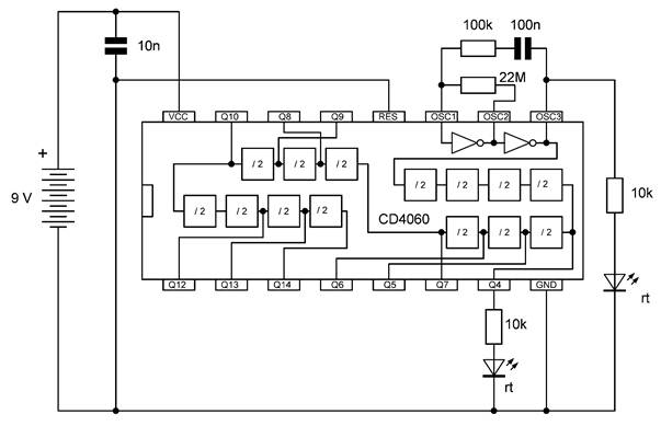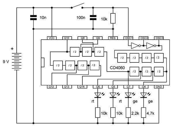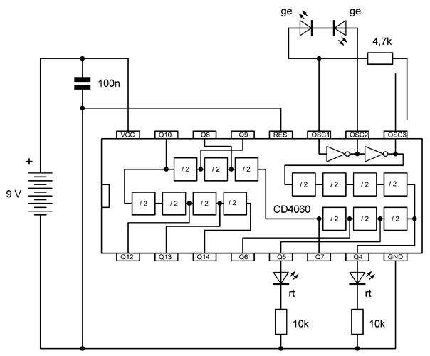 Die besonderen Blinkmuster entstehen, weil die LEDs nur in einer Richtung Strom leiten. Die untere gelbe LED leuchtet nur dann, wenn Q7 gerade ausgeschaltet ist und Q4 gerade an. So kann man mit LEDs an weiteren Ausgängen sehr unterschiedliche Muster erzeugen. Übrigens ist es in diesem Fall erlaubt, LEDs auch ohne Widerstände direkt zwischen zwei Ausgänge zu schalten. Die Ausgangstransistoren des 4060 haben bei einer Betriebsspannung von 9 V einen On-Widerstand von etwa 300 Ω. Beide Ausgänge zusammen haben damit einen Widerstand von 600 Ω. Daraus ergibt sich ein LED-Strom von rund 10 mA, der noch deutlich unter den erlaubten 20 mA liegt.