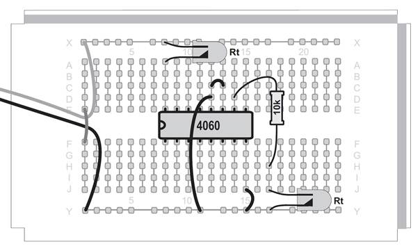Der erste Versuch verwendet einen Teil der Oszillatorschaltung an den Anschlüssen 10 und 11. Der Eingang OSC1 wird an GND (Minuspol, logisch Null) gelegt. Am Ausgang OSC2 liegt die LED mit ihrem Vorwiderstand. Wenn alles richtig aufgebaut wurde, leuchtet die LED. Das IC hat also die Spannung am Ausgang eingeschaltet (logisch Eins) und damit den Eingangszustand invertiert. Für die meisten Versuche mit dem 4060 muss zusätzlich der Reset-Eingang (RES) an GND gelegt werden. Die rote LED am VCC-Anschluss zeigt den Betriebsstrom an und schützt das IC. Wenn alles korrekt ist, leuchten beide LEDs gleich hell.