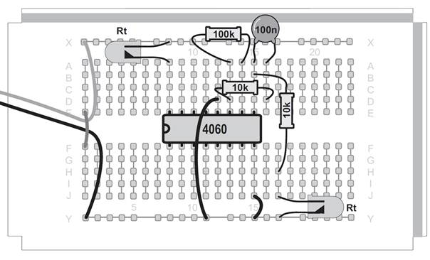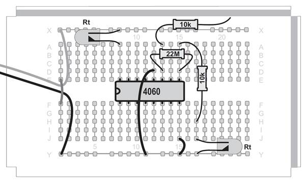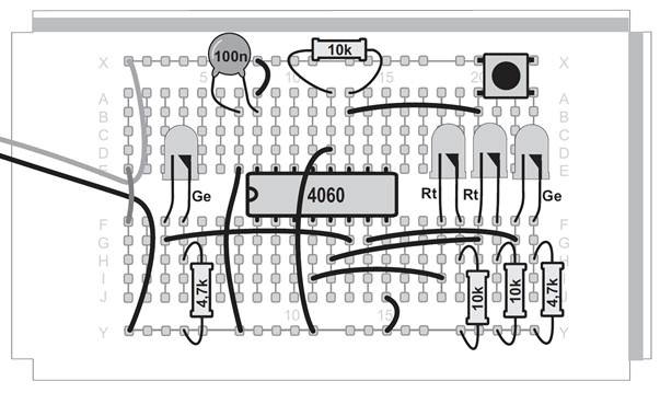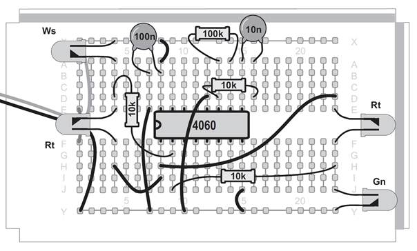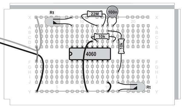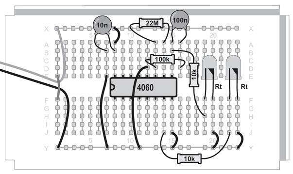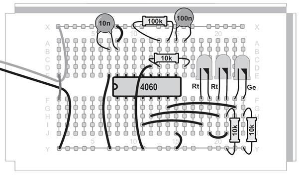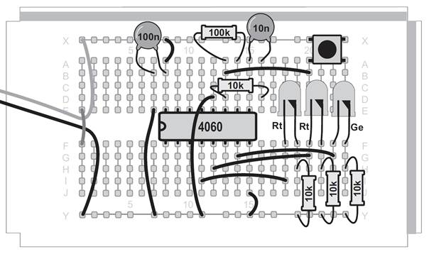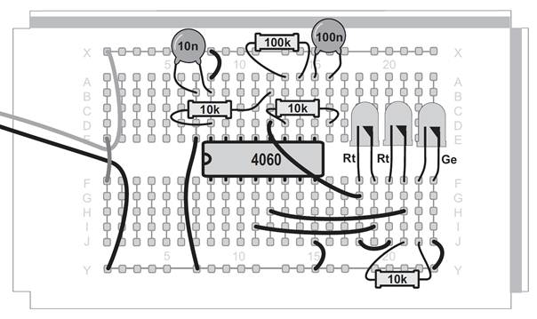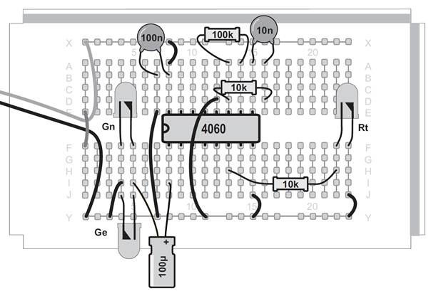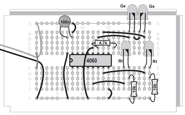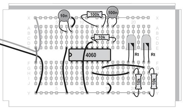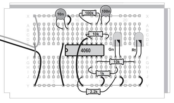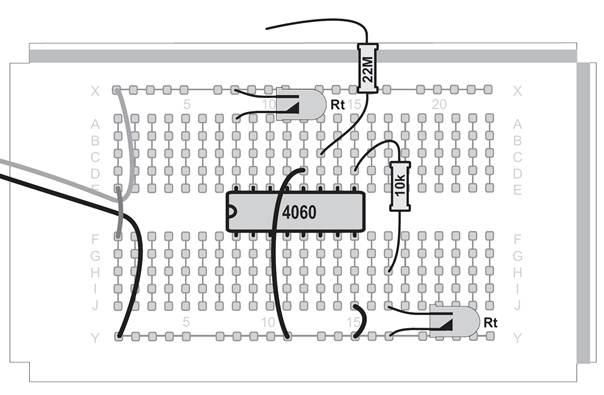 Ein Oszillator ohne den Kondensator, das mag zunächst verwundern. Tatsächlich ist aber ein sehr kleiner Kondensator vorhanden. Zwei nebeneinander liegende Kontaktstreifen der Steckplatinen bilden einen Kondensator mit etwa 4 Pikofarad (4 pF). Mit dem Widerstand von 22 MΩ ergibt sich damit eine Taktfrequenz von etwa 5 kHz. An Q6 erscheint die durch 64 geteilte Frequenz mit etwa 80 Hz. Diese schnellen Wechsel kann das menschliche Auge nicht mehr verfolgen. Noch schneller wird der Oszillator mit einem Widerstand von 100 kΩ. Er schwingt dann mit etwa 600 kHz und macht sich sogar in einem nahen Mittelwellenradio bemerkbar. Der Oszillator des CD4060 funktioniert mit den Bauteilen des Kalenders in einem riesigen Bereich zwischen 0,25 Hz und 600 kHz. Zusätzlich können Sie durch direktes Berühren des Eingangs meist einen genauen 50-Hz-Takt erzeugen. In diesem Versuch führt das dazu, dass die Blinkmuster deutlich langsamer durchlaufen werden.