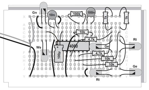 Die Grundhelligkeit der roten und gelben LEDs wird durch zwei Widerstände mit 1 kΩ vorgegeben. Größere Widerstände mit 4,7 kΩ und 10 kΩ schalten kleinere Ströme von verschiedenen Zählerausgängen hinzu und sorgen für ein schwaches und scheinbar unregelmäßiges Flackern. Es hat eine beruhigende Wirkung und ist auch für längere Zeit gut anzusehen. Die selten auftretenden Lichtblitze werden mit dem Ausgang Q10 und einem Elko von 100 µF erzeugt. Änderungen sind leicht möglich. Experimentieren Sie mit andern Zählerausgängen und veränderten Widerständen und bauen Sie Ihr ganz eigenes Weihnachtslicht.