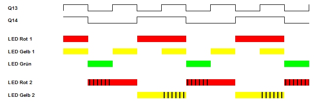 leuchten kann, wenn Q14 „HIGH“ und Q13 „LOW“ ist.