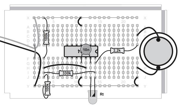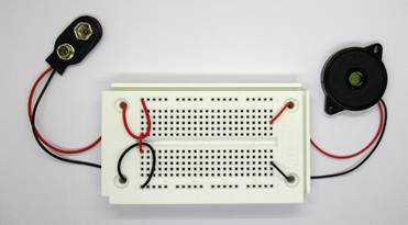 des Piezo-Schallwandlers an die Batterie. Beim ersten Anschluss hört man ein