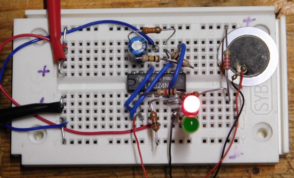 - Wird C2 gegen einen der 10nF-Kondensatoren gewechselt, erhält man einen Tongeber mit ca. 800 Hz.