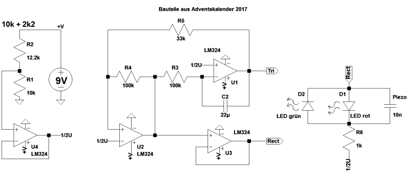 - Funktionsgenerator (Dreieck/Rechteck, U1/U2) mit Ausgangsbuffer für das Rechtecksignal (U3)