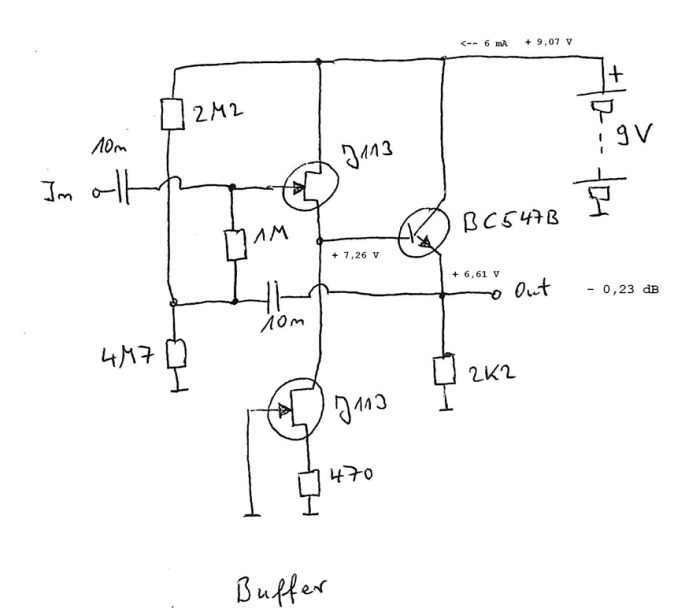 Die Schaltung besteht aus einem JFet als Sourcefolger und einem zweiten