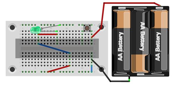 Es ist der erste Tag im Dezember und damit Zeit, das erste Türchen des Kalenders zu öffnen. Hinter diesem Türchen befinden sich gleich mehrere Bauteile. Neben dem Batteriefach, einem Tastschalter und einer LED findet sich dort auch ein aufgewickelter Draht, von dem einige Stücke für das erste Spiel gebraucht werden. Es geht um ein Suchspiel. Ein Draht in der Mitte (blau gezeichnet) wird mit einem Stück Karton abgedeckt. Ein Spielpartner muss nun die richtigen Anschlüsse suchen und die beiden rot gezeichneten Drähte einsetzen. Wenn er dann auf den Knopf drückt, leuchtet die LED. Wer möchte, kann das Spiel noch erweitern und mehrere geheime Drähte einbauen. Auf den Karton könnte man ein Labyrinth mit mehreren Wegen zeichnen. Der Phantasie sind keine Grenzen gesetzt.