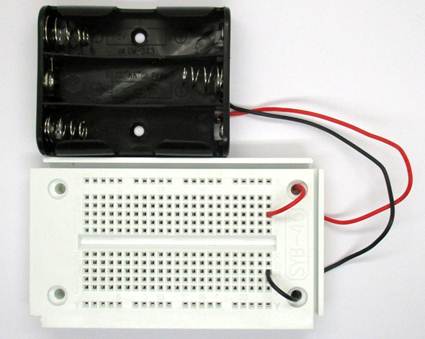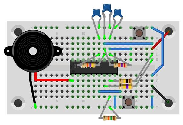Die Anschlüsse des Batteriefachs verwenden weiche Drahtlitze, die am Ende abisoliert und verzinnt ist. Die Enden lassen sich in die Kontakte stecken. Aber sie sollten möglichst nur einmal eingesteckt werden und dann immer an ihrer Position bleiben, weil sie bei mehrfachem Einstecken leicht abnutzen und weicher werden. Stechen Sie Löcher in die untere Abdeckfolie der Steckplatine und führen Sie die Drähte von unten hindurch. Damit erreicht man eine Zugentlastung und eine stabile Befestigung. Das schwarze Kabel soll genau im Kontakt H23 stecken, das rote im Anschluss C23. Dann muss die Position bis zum 24. Spiel nicht mehr geändert werden. Immer wenn Sie Sie Ihr Spiel ausschalten wollen, entfernen Sie eine Batterie aus dem Batteriefach.