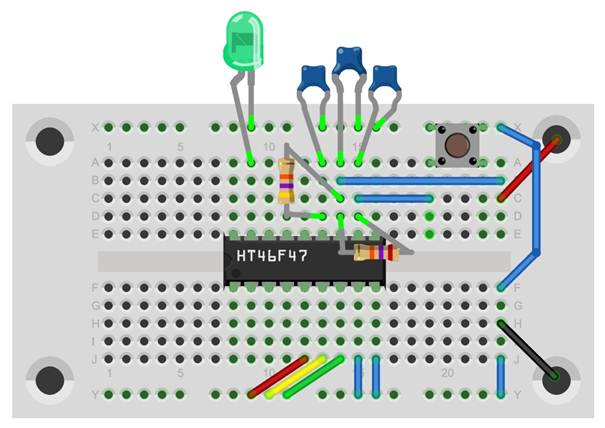Hinter dem heutigen Türchen befinden sich mehrere ganz wichtige Bauteile. Das wichtigste ist der Mikrocontroller HT46F47 mit seinen 18 Anschlussbeinchen. Dass es so viele Anschlüsse sind, zeigt schon, dass man sehr viele Möglichkeiten für unterschiedliche Spiele hat. Aber einige Anschlüsse werden immer gleich verwendet und sind unbedingt nötig, damit der Mikrocontroller überhaupt funktioniert. Dazu muss man einige Drähtchen anschließen und zusätzlich zwei Widerstände und drei Kondensatoren. Rechts oben auf der Steckplatine findet man den Reset-Schalter.