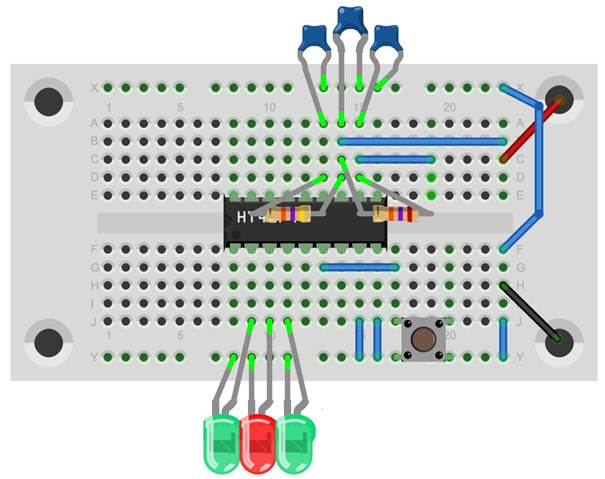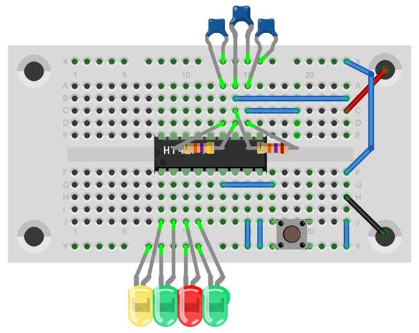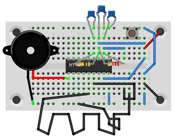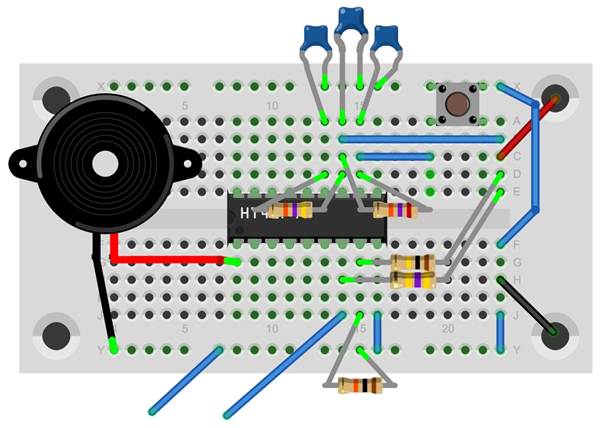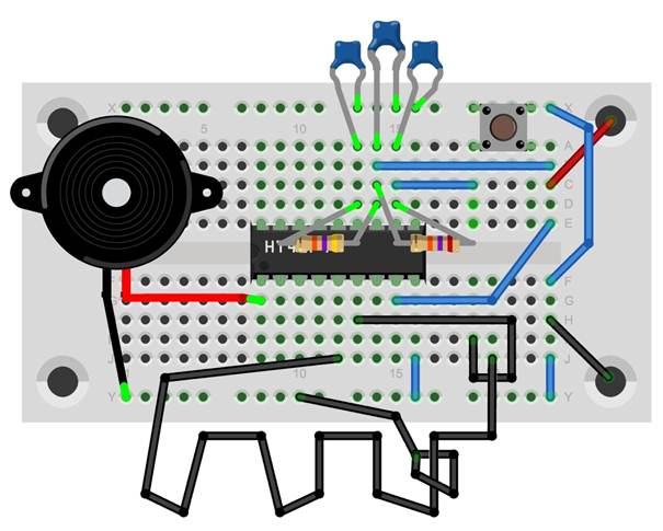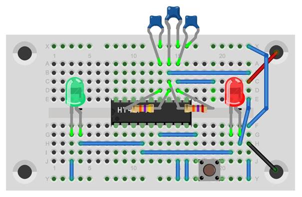 Und jetzt kommt das Spiel! Der ganze Aufbau ist eine tickende Zeitbombe, die unbedingt entschärft werden muss. Im Plan sind drei Drähte eingezeichnet, ein roter, ein gelber und ein grüner. Aber nur einer davon soll eingesteckt werden, und die Farbe ist natürlich nicht wichtig. Man kann die Verbindungen auch nacheinander versuchen. Aber in welcher Reihenfolge und zu welchem Zeitpunkt, das kann man nicht wissen. Wenn man es richtig macht, bleibt die LED aus. Aber wenn man es falsch macht, bleibt die LED ganz an und die Bombe explodiert.