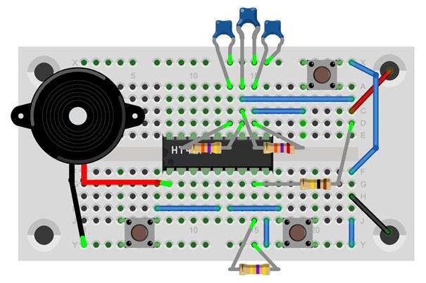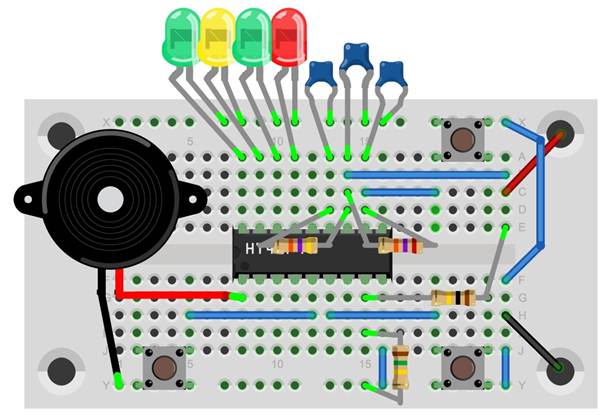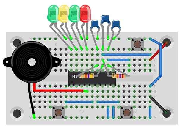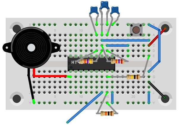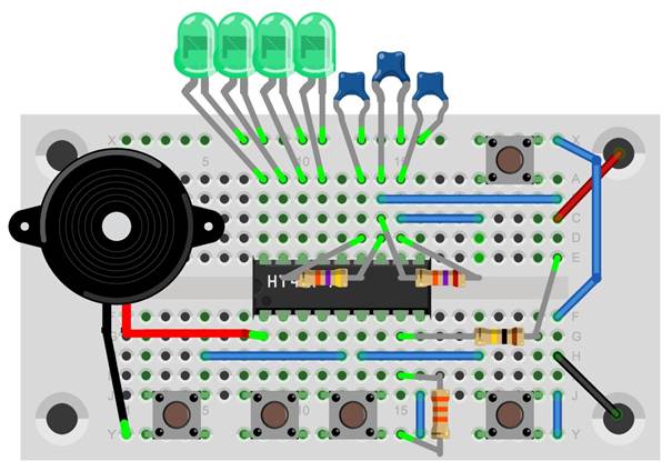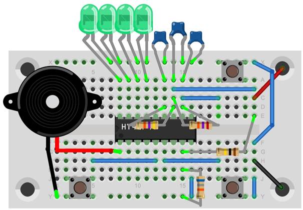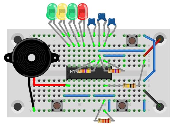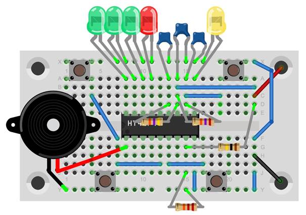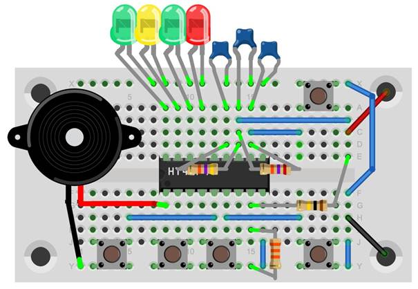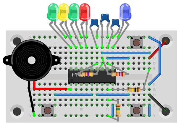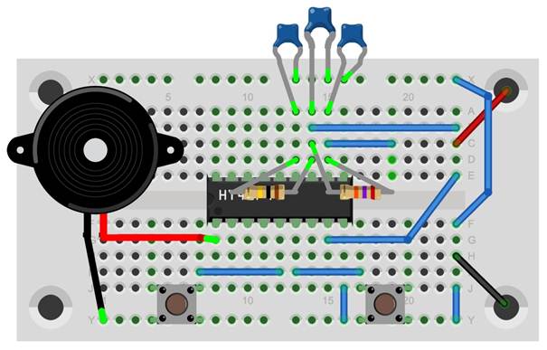 Bei diesem Spiel gibt es vier unterschiedliche Farben, die in einer zufälligen Reihenfolge aufleuchten. Zu jeder Farbe gibt es einen eigenen Ton. Die Aufgabe besteht darin, sich die Farben zu merken und die Folge mit den Tasten zu wiederholen. Die linke Taste schaltet die rote LED ein, die zweite von links die gelbe, und so weiter. Außerdem werden auch die zugehörigen Töne gespielt. Beim ersten Durchlauf müssen Sie sich nur eine Farbe merken, beim zweiten schon zwei. Und so geht es weiter bis zu einer Abfolge von zehn Farben und Tönen. Wenn Sie die Zehnerfolge korrekt wiederholen können, haben Sie das Spiel gewonnen. Dann ertönt die bekannte Sieger-Fanfare. Aber wenn Sie schon vorher eine falsche Taste drücken, endet das Spiel vorzeitig mit dem Verlierer-Sound. Da muss man sich sehr konzentrieren. Veranstalten Sie ein Turnier. Wer schafft die meisten fehlerfreien Spiele?