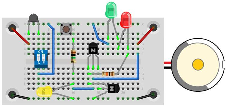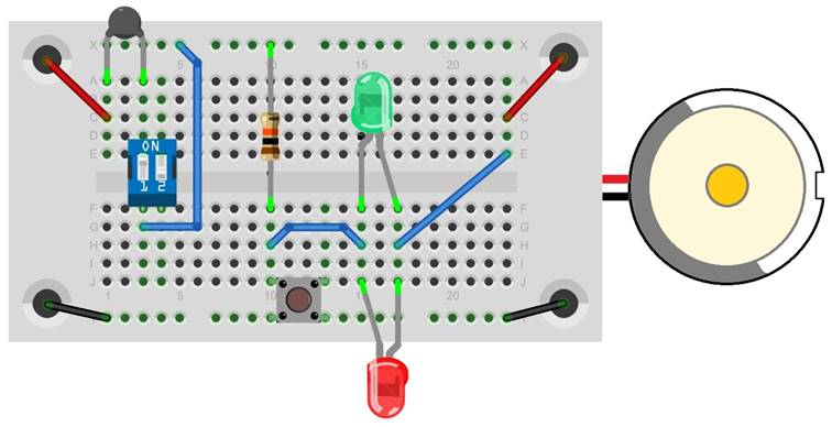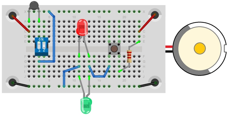 In dieser Schaltung gibt es wieder den Tastschalter, und wieder entstehen kleine rote und grüne Lichtblitze bei jedem Schalten. Und zusätzlich hörst du jetzt jedes Mal ein leises aber deutliches Knacken aus dem Lautsprecher. Allerdings kann es sein, dass das Klicken des Tastschalters den Lautsprecher übertönt. Verwende dann einen Draht oder einen Gegenstand aus Metall, um die zwei Anschlüsse des Tasters ganz leise zu verbinden