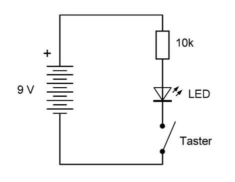 Achtung! Eine LED darf niemals ohne einen Widerstand direkt an eine Batterie angeschlossen werden! Ohne den Widerstand wäre der Strom zu groß und die LED würde zerstört.