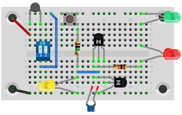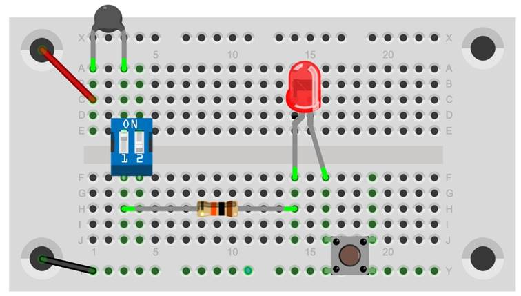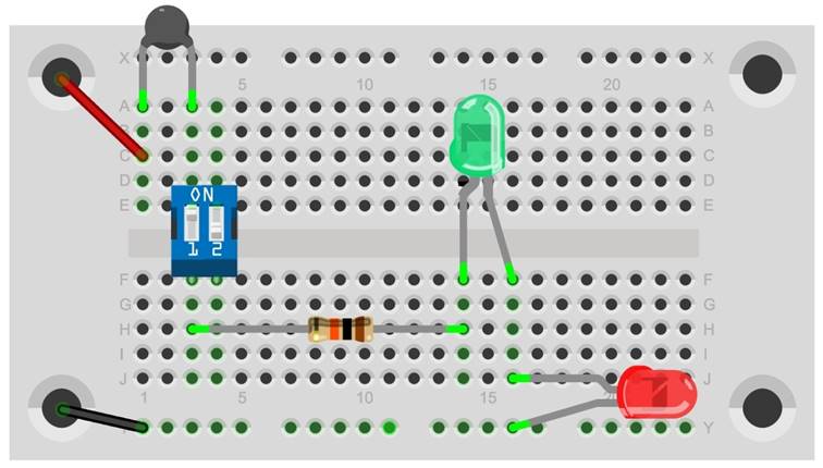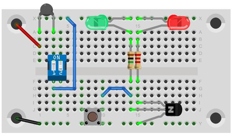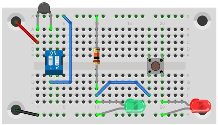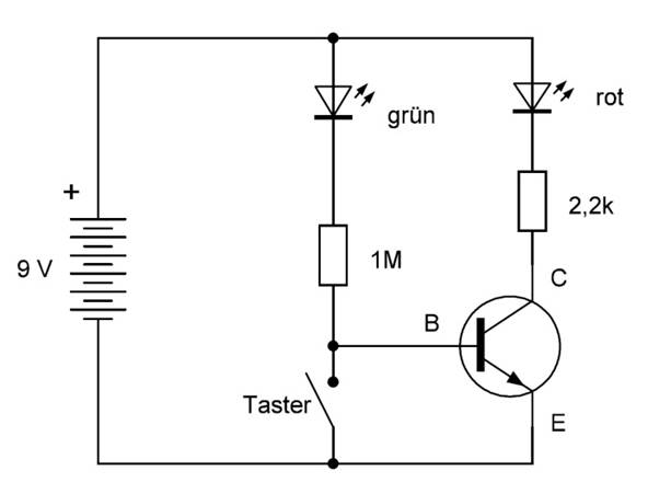 Der Versuch zeigt das typische Verhalten eines Transistors. Wenn der Tastschalter noch geöffnet ist, leuchtet die grüne LED nur schwach, aber die rote sehr hell. Drückt man auf den Taster, geht die rote LED aus. Der Transistor verhält sich wie ein Schalter. Ein kleiner Strom durch den Basisanschluss bewirkt, dass ein großer Strom durch den Kollektoranschluss eingeschaltet wird. Wenn du aber Basis und Emitter über den Taster verbindest oder die grüne LED herausziehst, geht auch die rote LED aus.