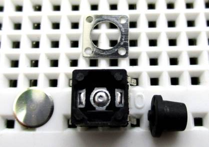 Im Inneren des Tastschalters befindet sich ein leicht nach oben gewölbtes Blech, das mit einem Druck auf den Knopf eingedrückt wird. Bei einer ganz bestimmten Kraft macht es Klick und das Blech wölbt sich nach unten. Dabei berührt es den Kontakt in der Mitte und schließt damit den Stromkreis.