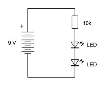 Die Batteriespannung von 9 V teilt sich auf drei Verbraucher auf. Die rote LED hat 1,8 V, die grüne hat 2,2 V und der Widerstand hat 5 V. Wenn man alle Teilspannungen zusammenzieht, erhält man die Gesamtspannung, 1,8 V + 2,2 V + 5,0 V = 9,0 V.