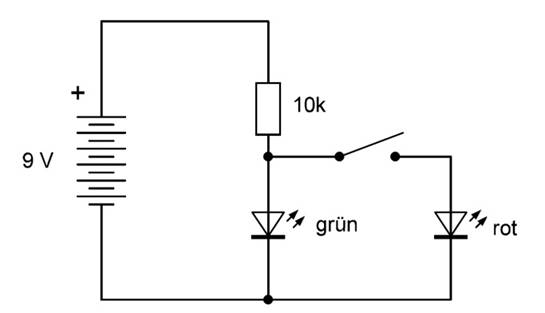 Wenn der Schalter geschlossen ist, sind beide LEDs parallel geschaltet. Man könnte denken, dass dann durch beide Strom fließt und dass beide leuchten. Das ist auch tatsächlich so, wenn gleiche LEDs verwendet werdet werden. Aber hier gibt es einen großen Unterschied. Die grüne LED braucht mehr Spannung als die rote LED. Wenn nun die rote LED eingeschaltet wird, sinkt die LED-Spannung so weit ab, dass die grüne nicht mehr leuchten kann.