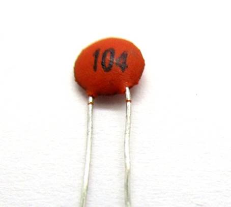 Ein Kondensator besteht aus zwei Metallflächen mit einer isolierenden Schicht dazwischen. Deshalb wird er im Schaltbild mit zwei nicht verbundenen Strichen dargestellt. Das Bauteil hat zusätzlich eine äußere Schutzschicht und kann je nach Fabrikat ganz unterschiedlich aussehen. In den Aufbaubildern wird ein blauer, viereckiger Kondensator dargestellt, deiner ist rund und hellbraun. Die Beschriftung verrät, wieviel Kapazität dieser Kondensator hat. Das ist ein Maß dafür, wieviel Energie der Kondensator bei einer bestimmten Spannung enthält. Die Einheit der Kapazität heißt Farad (nach dem berühmten Forscher Michael Faraday). Die kleineren Einheiten sind Mikrofarad (µF), Nanofarad (nF) und Picofarad (pF). Die Beschriftung 104 steht für 1, 0, 0000, also 100.000 Picofarad, 100.000 pF = 100 nF.