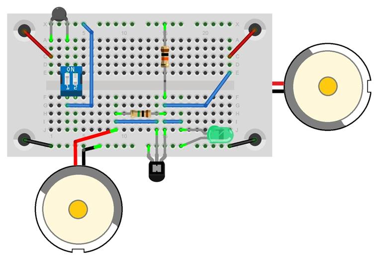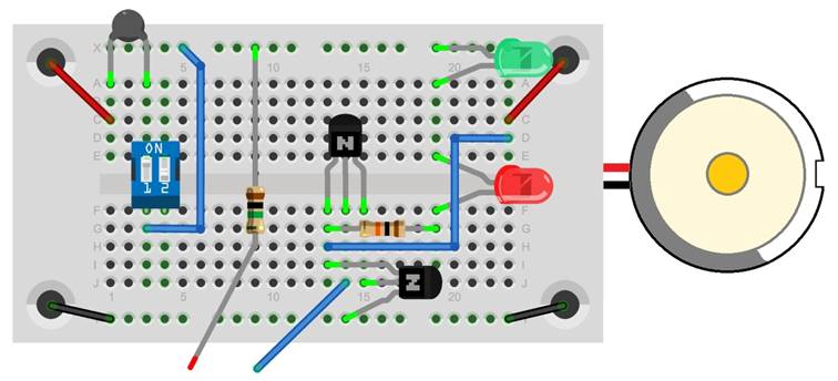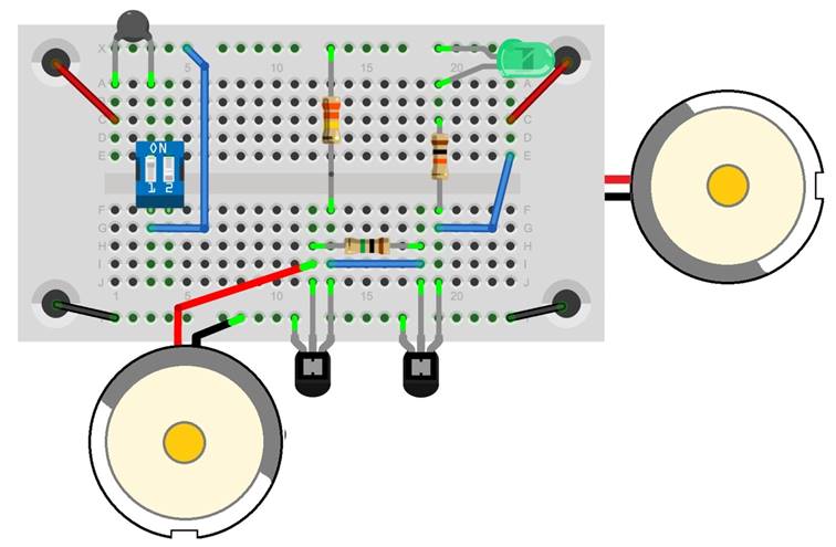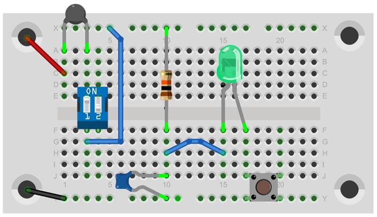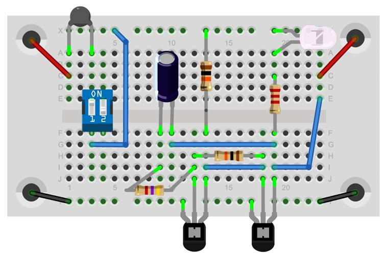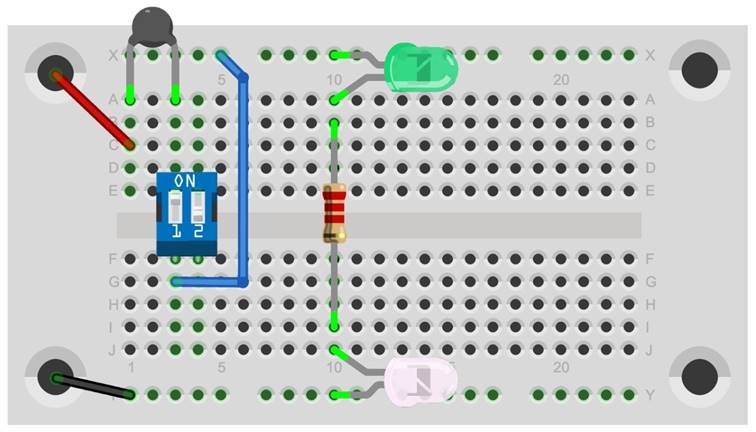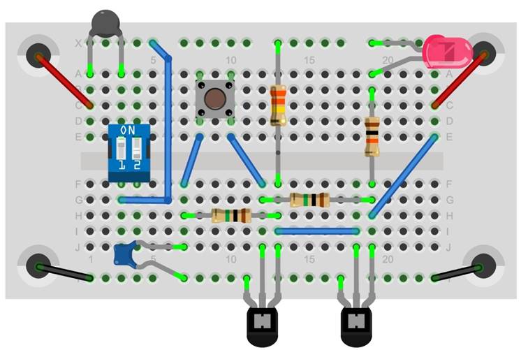 Diese Schaltung nennt man auch ein Flipflop, weil sie zwischen den zwei Zuständen An (Flip) und Aus(Flop) umschalten kann. In diesem Fall wird das Umschalten durch Beleuchtung und durch Abschatten erreicht. Der Widerstand von 10 kΩ bestimmt die Helligkeit, ab der das Flipflop in den An-Zustand wechselt. Wenn du an seiner Stelle einen Widerstand mit 330 kΩ einbaust, reagiert die Schaltung schon auf sehr viel schwächeres Licht.