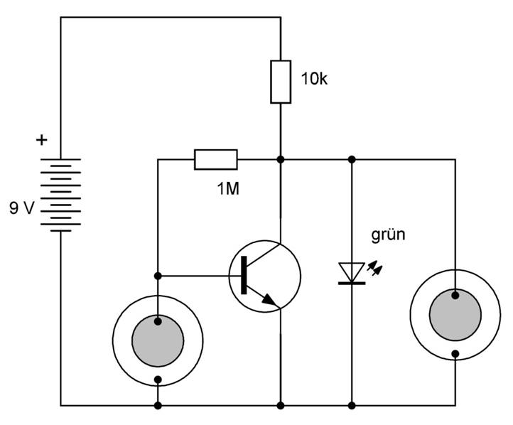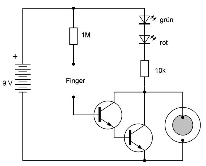 Am Kollektor der Transistoren ist wieder der Lautsprecher angeschlossen. Und manchmal hört man besondere Geräusche. Fasse nur das Basis-Kabel an. Je nach Ort hörst du dann ein Knistern, Summen oder Brummen aus dem Lautsprecher. Das Geräusch kann noch stärker werden, wenn zwei Personen beide Drähte berühren. Es stammt von den elektrischen Leitungen im Raum. Wenn du zusätzlich die Füße auf dem Boden bewegst, kann manchmal ein Blinken oder Flackern der LEDs beobachtet werden. Es zeigt die elektrische Aufladung deines Körpers durch Reibung an den Schuhen.