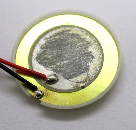 Das isolierende Material in deinem Piezo-Lautsprecher ist ein keramischer Werkstoff, ähnlich wie Porzellan. Wenn man eine elektrische Spannung anschließt, verbiegt sich die Scheibe etwas. Dabei entsteht ein Geräusch.