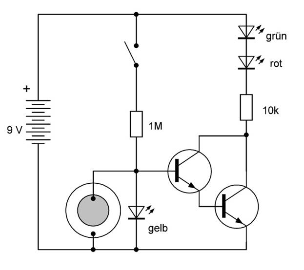 Jede Diode besteht aus einem Halbleiter mit einer PN-Sperrschicht, die in einer Richtung den Strom leitet und in der anderen keinen Strom hindurchlässt, also den Strom sperrt. Außer Leuchtdioden gibt es auch noch Gleichrichterdioden und Fotodioden aus Silizium, also dem gleichen Material, aus dem auch deine Transistoren gebaut sind. Bei einer Fotodiode verwendet man eine besonders große Fläche, sodass viel Licht von außen in die Sperrschicht eindringen kann. Dort sorgt das Licht dafür, dass eine elektrische Spannung entsteht und Strom fließen kann. Eine LED ist ähnlich aufgebaut, hat aber nur eine sehr kleine Fläche. Deshalb ist der lichtabhängige Strom nur klein. Nach einer großen Verstärkung durch die beiden Transistoren reicht er aber für diesen Versuch aus.