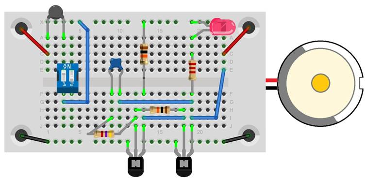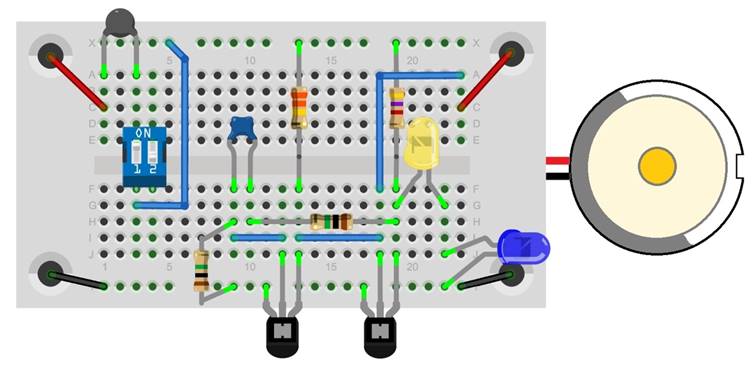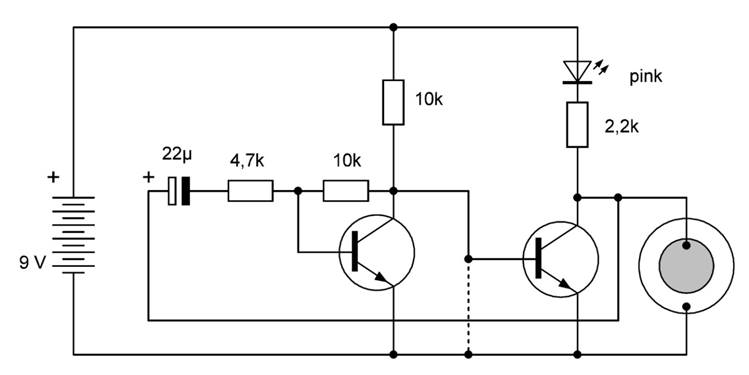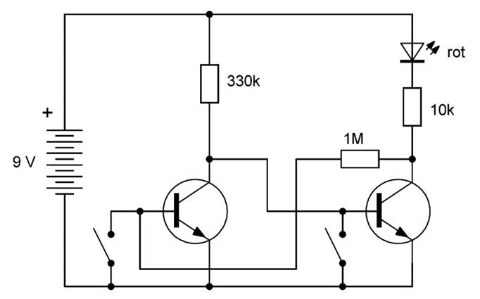 Diese Schaltung lässt sich auch als Alarmanlage verwenden. Im Schaltbild ist eine gestrichelte Linie eingezeichnet, die ein Kabel darstellt, das entweder vorhanden ist oder nicht. Wenn du ein Kabel zwischen Basis und Emitter des rechten Transistors einbaust, schaltest du damit das Blinken ab. Dieses Kabel ist deine Alarmschleife. Mit einem Faden kann es so an eine Tür oder ein Fenster gebunden werden, dass ein Öffnen es herauszieht. Dann sieht man den Alarm. Wenn du den kleinen Kondensator mit 10 nF einsetzt, wird der Alarm hörbar. Und du kannst eine LED-Farbe einsetzen, die dir am besten gefällt.