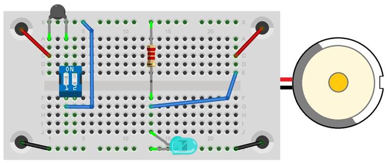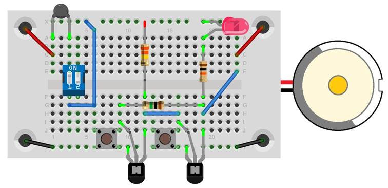 Man kann nicht vorhersagen, ob die LED nach dem Einschalten leuchten wird. Du kannst aber den Zustand umzuschalten, indem du auf einen der Schalter drückst. Ein Umschalten passiert immer dann, wenn du an dem gerade leitenden Transistor durch den gedrückten Schalter die Basis mit dem Emitter verbindest. Der Piezolautsprecher gehört nicht unbedingt zu diesem Versuch und ist deshalb auch nicht im Schaltbild eingezeichnet. Aber wenn du ihn wie im Aufbaubild anschließt, hörst du bei jedem Umschalten ein Knacken. Wenn aber das Knacken der Schalter das Geräusch aus dem Lautsprecher übertönt, kannst du das Umschalten auch mit einem Kabel versuchen, indem du jeweils die Basis mit dem Emitter verbindest.