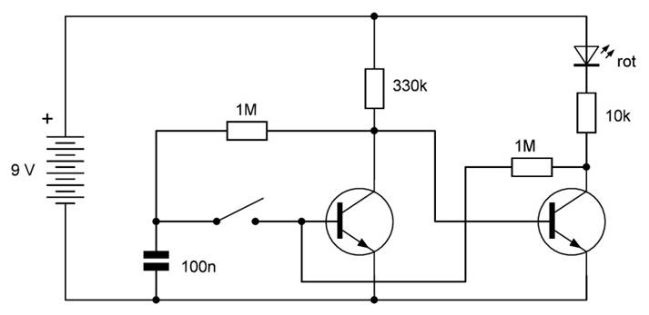 Eine Schaltung wie diese nennt man ein monostabiles Flipflop. Das bedeutet, dass es nur einen stabilen Zustand gibt, in diesem Fall den Aus-Zustand. Der An-Zustand wird nur für eine kurze Zeit eingeschaltet, und zwar so lange bis der Kondensator vollständig aufgeladen ist.
