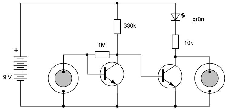 Die Verbindung von zwei Transistoren wie im Schaltbild nennt man eine Darlington-Schaltung. Zwei Transistoren verstärken mehr als einer. Das gilt besonders für diese Schaltung, bei der der schon verstärkte Strom von einem zweiten Transistor noch einmal verstärkt wird. Der Name stammt von ihrem Erfinder Sidney Darlington, der schon 1952 auf diese Idee kam. Beide Kollektoren sind verbunden, und der Emitter des ersten Transistors fließt zur Basis des zweiten. Die Darlington-Schaltung verhält sich wie ein einzelner Transistor mit riesiger Verstärkung.