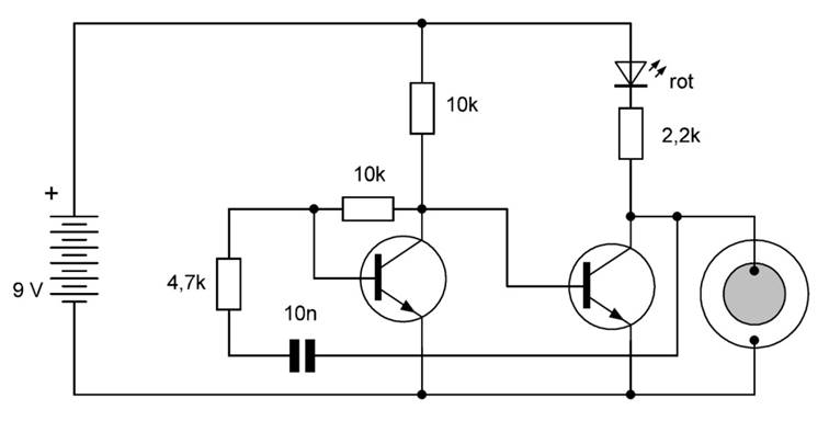 Die beiden Transistoren schalten sich gegenseitig immer wieder ein und aus. Diese Schaltung nennt man ein astabiles Flipflop, denn keiner von beiden Zuständen ist stabil. Die schnellen Änderungen erzeugen eine Bewegung der Piezoscheibe und damit einen Ton.
