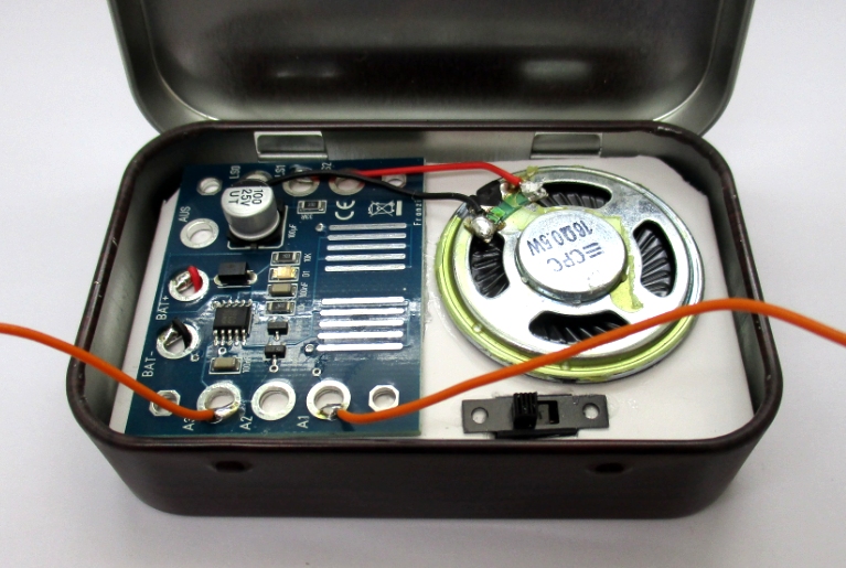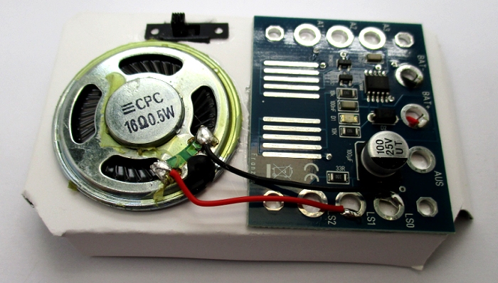 einem etwas kleineren Lautsprecher und einem Schiebeschalter. Auf die