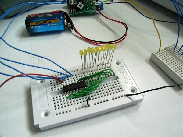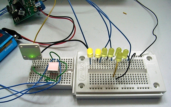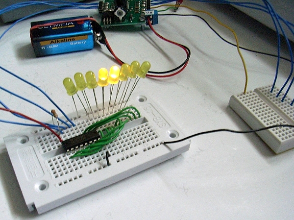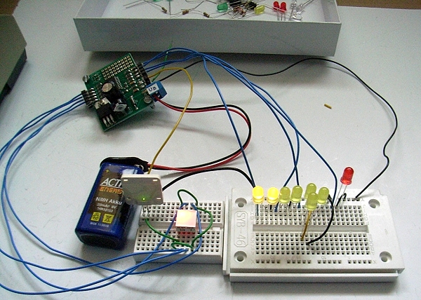 mit der Schaltung auf dem Steckboard ein Lauflichts mit 8 gelben