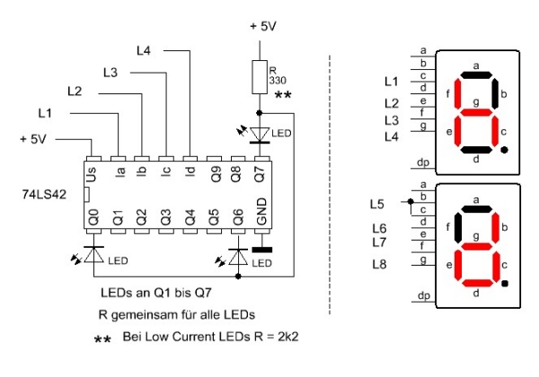 Die Katoden aller Leuchtdioden sind mit einem der Ausgänge Q0