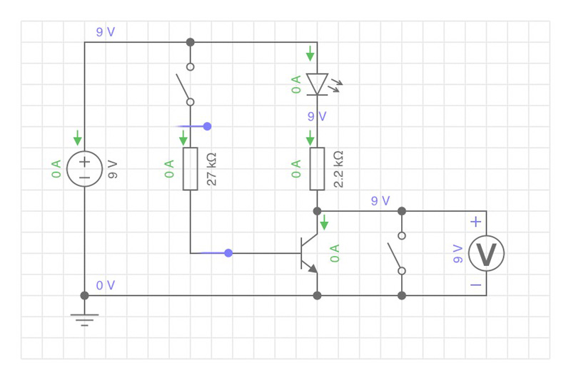 Höhe von 9 Volt fällt an seiner Kollektor-/Emitterstrecke ab. Es fließt kein Kollektorstrom