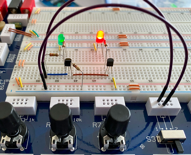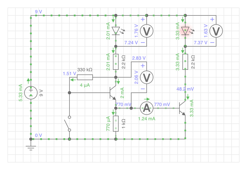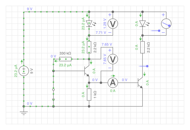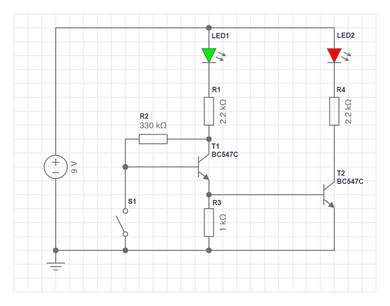 LED bleibt daher dunkel. Beide Transistoren sperren, damit leuchtet auch LED2